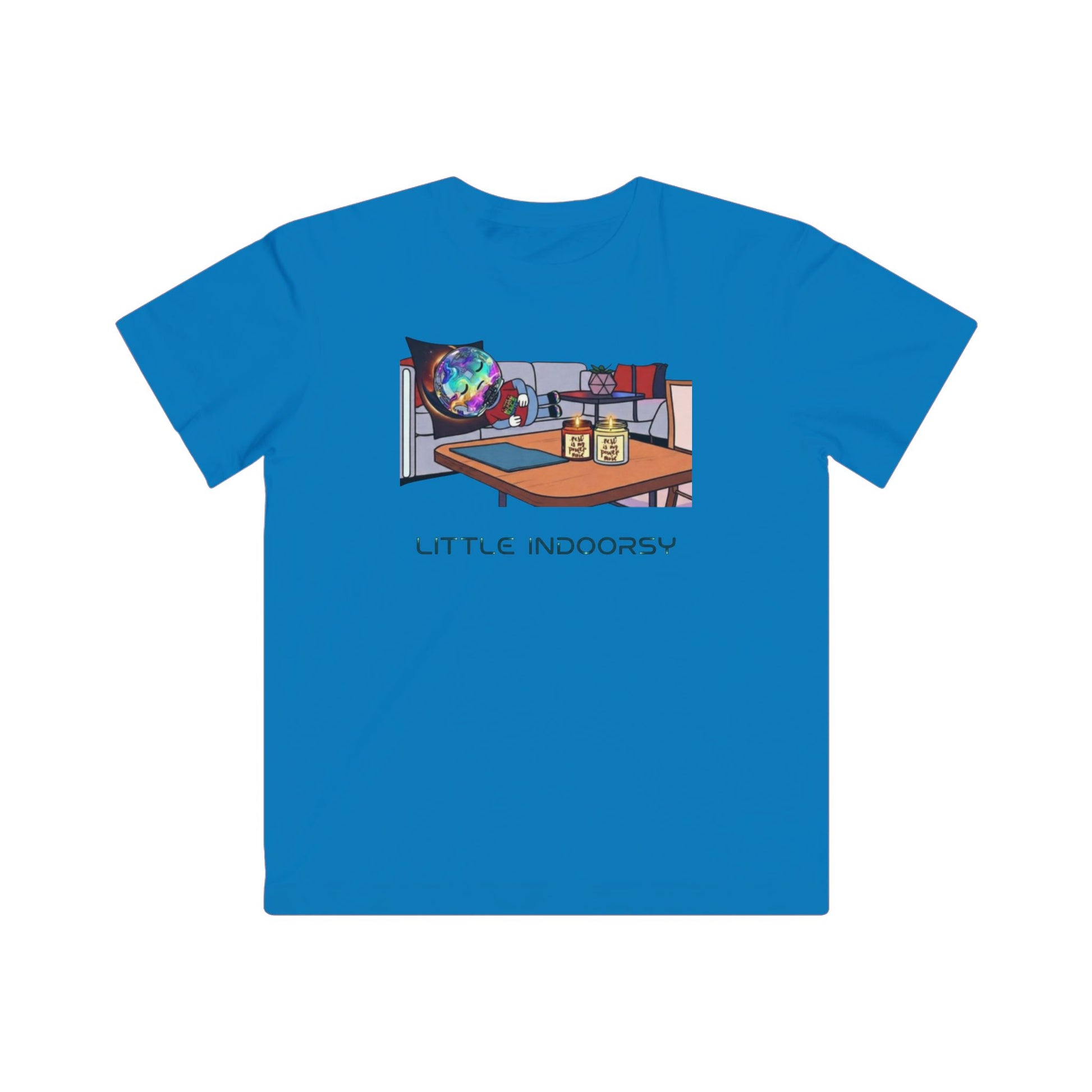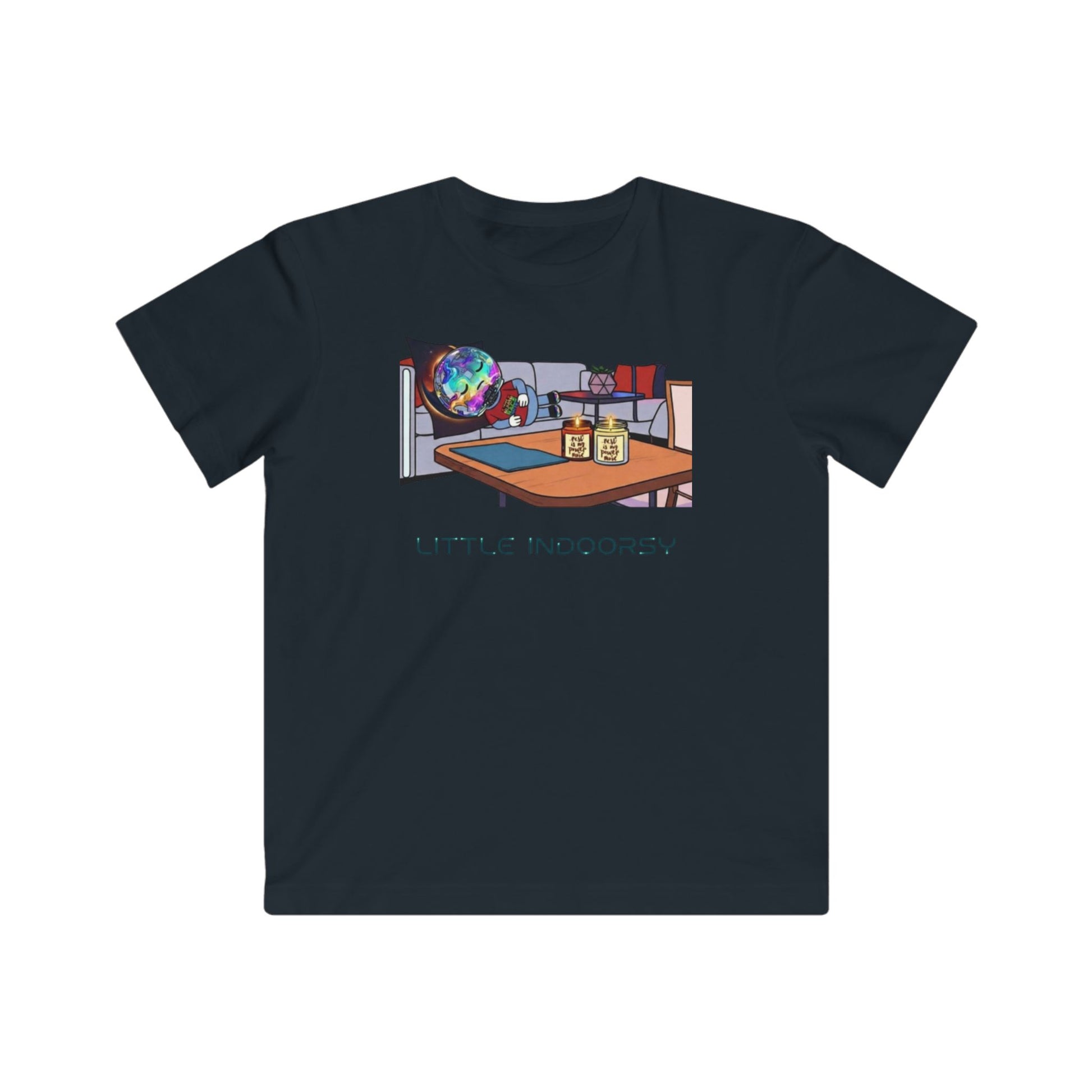 This kids jersey tee wraps little explorers in breathable, light-weight cotton and a calm, futuristic print — a cosmic traveler lounging on the sofa, mid-orbit between cozy cushions and warm candlelight.